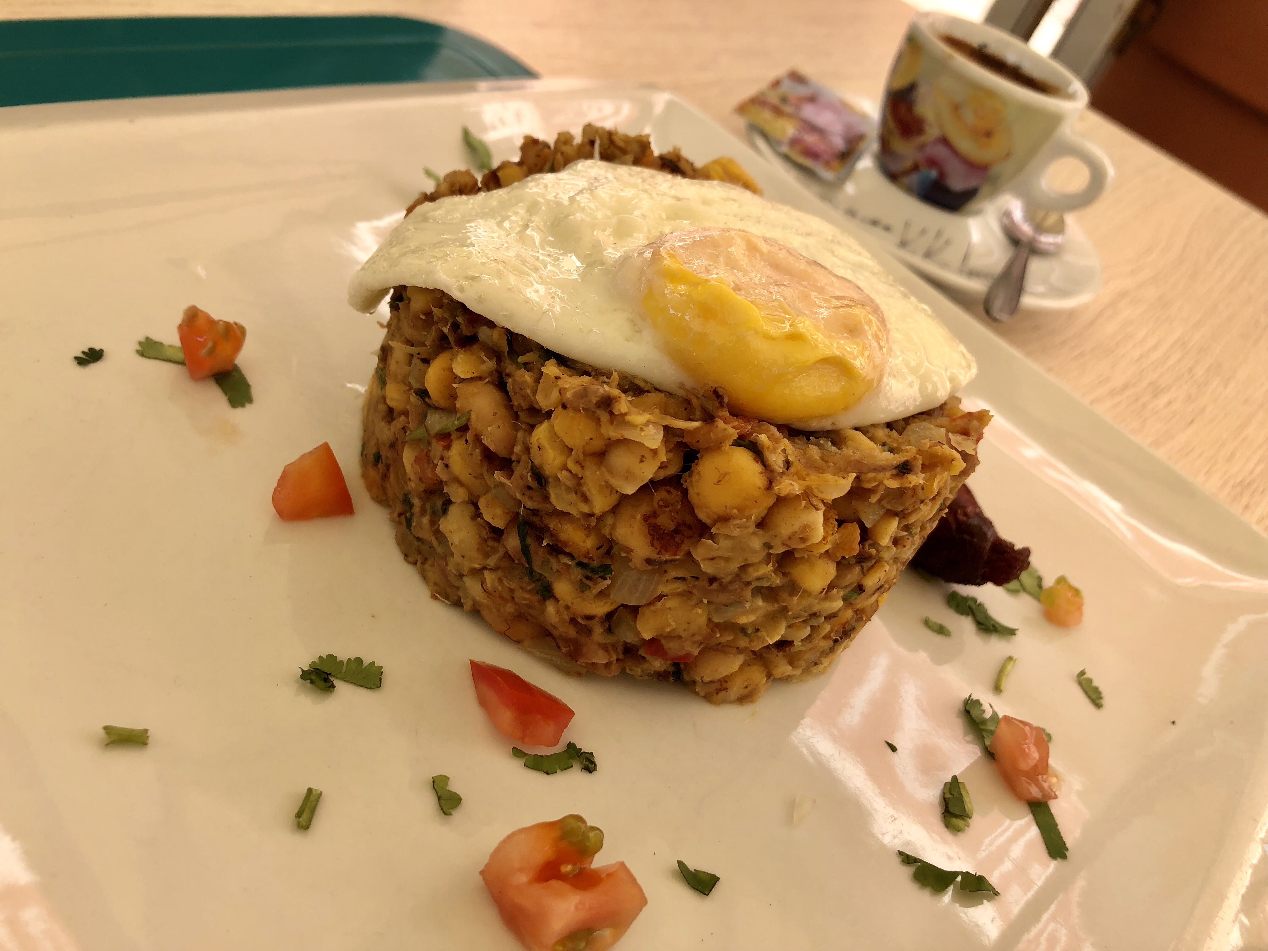 やさしい味付けに塩気の強いソーセージとやわらかい目玉焼きがマッチします。