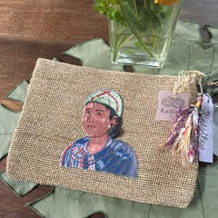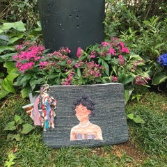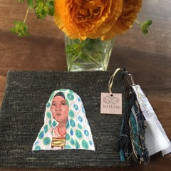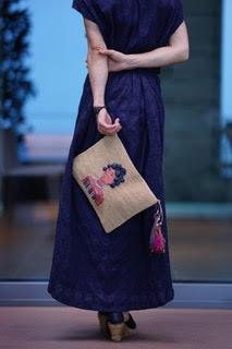 マダガスカルの部族(全部族ではないのですが・・・)の女性を刺繍で表現したものを、細編みしたラフィアのボディーにマウントしています。部族名のついたタッセルは国内の布作家TIAさんとのコラボ商品です。