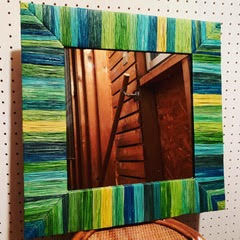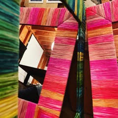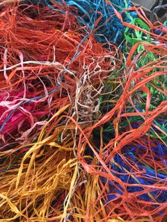 カラフルなラフィアを編み子さんたちがせっせと編んで形にしてい